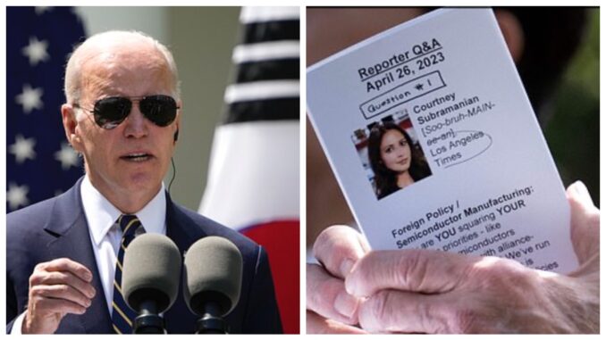Biden’ın kendisine yöneltilecek sorulara evvelden hazırlık yaptığı ve hatta soru soracak gazetecilerin isimlerinin söyleminin bile yazılı olduğu tespit edildi. Biden’ın elindeki kağıtta birinci soruyu Los Angeles Times muhabiri Courtney Subramanian‘ın soracağı ve soruların ayrıntılarının yer aldığı belirtildi. Subramarian’ın soracağı sorunun “Yarı iletken üretiminin yine paylaştırılması üzere lokal önceliklerinizi ittifak temelli dış siyaset ile nasıl karşılaştırıyorsunuz?” olduğu görüldü.
