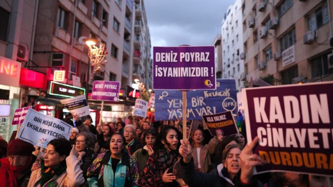 İzmir Bayan Platformu, 25 Kasım Bayana Yönelik Şiddete Karşı Milletlerarası Uğraş Günü kapsamında bugün “Savaşa, yoksulluğa, gericiliğe, erkek-devlet şiddetine karşı uğraşımızı yükseltiyoruz ” diyerek, Alsancak’taki eski Leman Kültür önünde bir ortaya geldi. “Tayyip kaç kaç kaç, bayanlar geliyor”, “Susmuyoruz, korkmuyoruz, itaat etmiyoruz”, “Dünya yerinden oynar, bayanlar özgür olsa” sloganlarını atan ve Türkan Saylan Kültür Merkezi önüne yürüyen bayanların hareketinde Halkların Eşitlik ve Demokrasi Partisi (HEDEP) İzmir Milletvekili Burcugül Çubuk da katıldı.