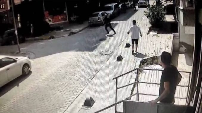 İstanbul Küçükçekmece’de mesken sahibi ile kiracı ortasında çıkan artırım tartışmasında mesken sahibinin oğlu silahla ateş ederek kiracıyı yaraladı. Olay anı güvenlik kamerasına yansıdı.
